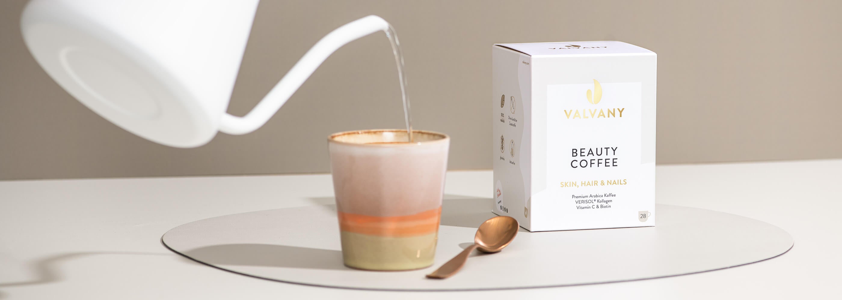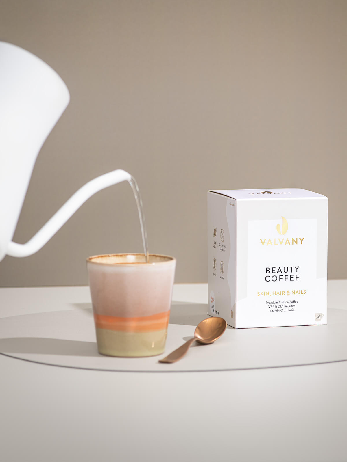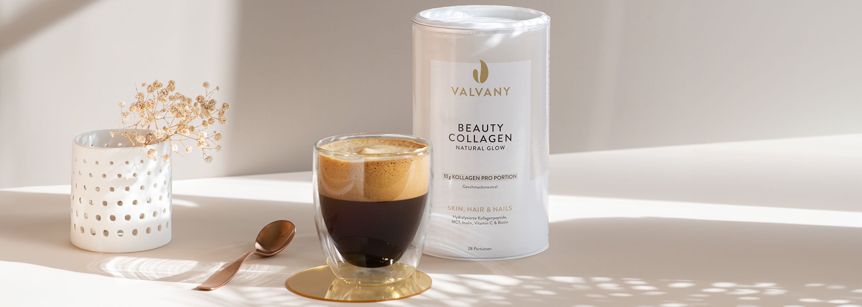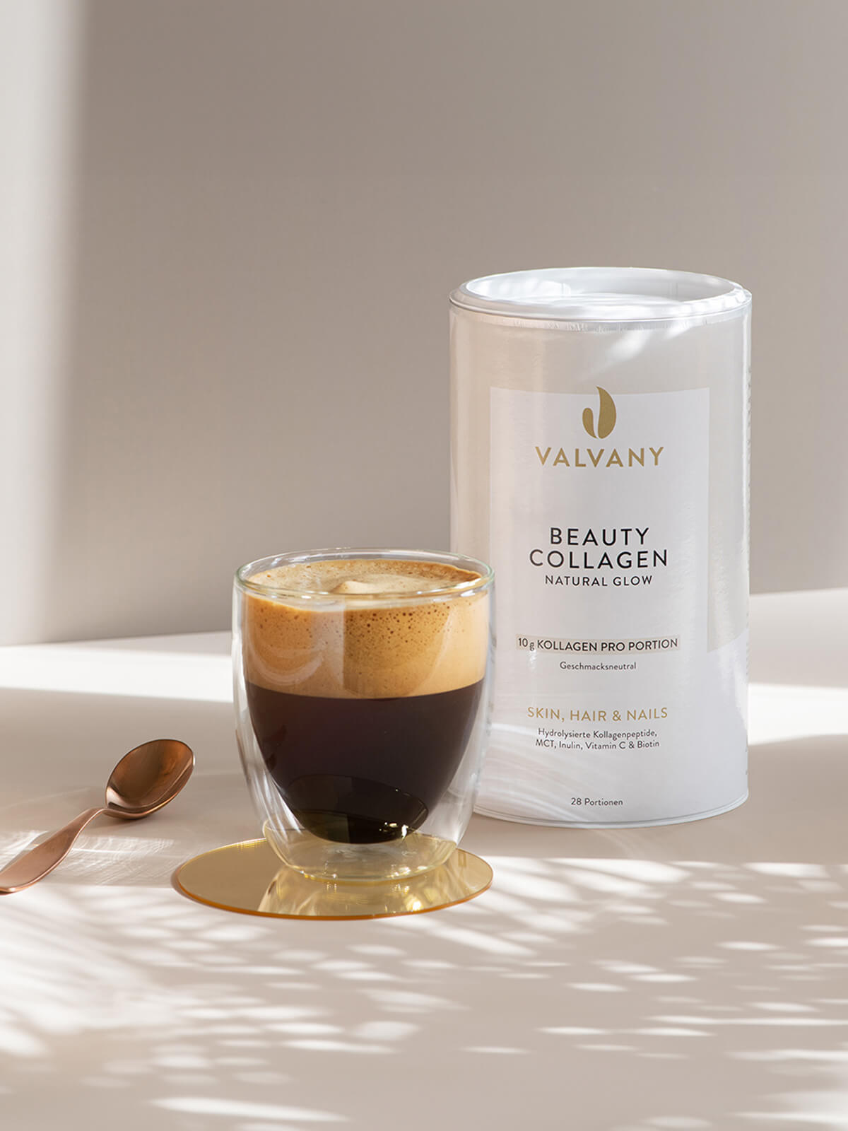Steigere dein Wohlbefinden und deine natürliche Austrahlung, ganz einfach mit deiner täglichen Tasse Kaffee. Mit patentiertem VERISOL® Kollagen, bioverfügbarem Vitamin C aus der Camu Camu Frucht, Biotin und Silizium.